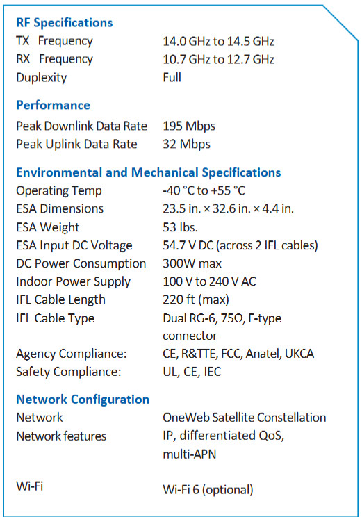 Dieses Terminal verfügt über eine fortschrittliche elektronisch gesteuerte Antennentechnologie (ESA), die für die Integration mit der OneWeb Ku-Band LEO-Satellitenkonstellation optimiert ist. Dieses kompakte Vollduplex-Terminal verfügt über ein integriertes Modem, das eine schnelle und kostengünstige Kommunikation mit hoher Bandbreite und minimaler Latenzzeit ermöglicht.